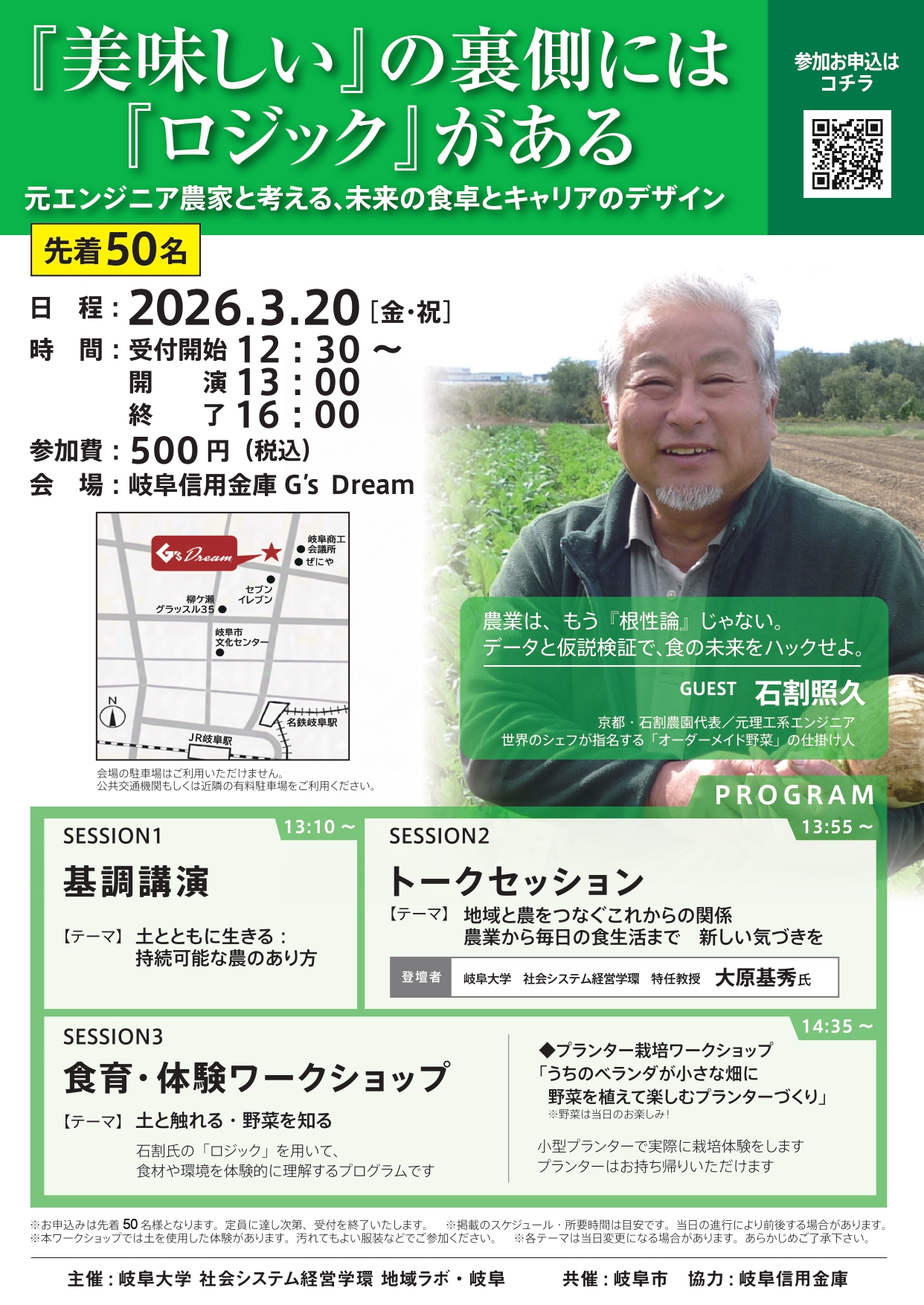 地域ラボ・岐阜は、令和8年3月20日(金・祝)に「『美味しい』の裏側には『ロジック』がある~元エンジニア農家と考える、未来の食卓とキャリアのデザイン~」を開催します。