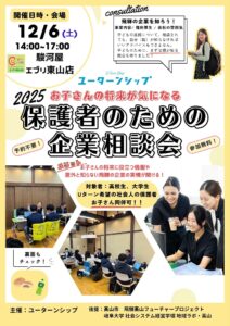 地域ラボ・高山では、令和7年12月6日(土)、ユーターンシップ主催の『ユーターンシップ2025お子さんの将来が気になる~保護者のための企業相談会~』の開催に協力します。