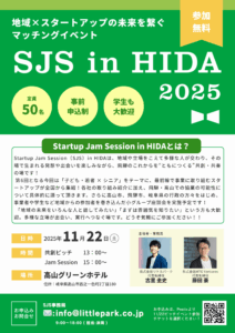 地域ラボ・高山は、令和7年11月21日(金)、22日(土)株式会社リトルパーク主催の『SJS in HIDA 2025~地域×スタートアップの未来を繋ぐマッチングイベント~』の開催に協力します。