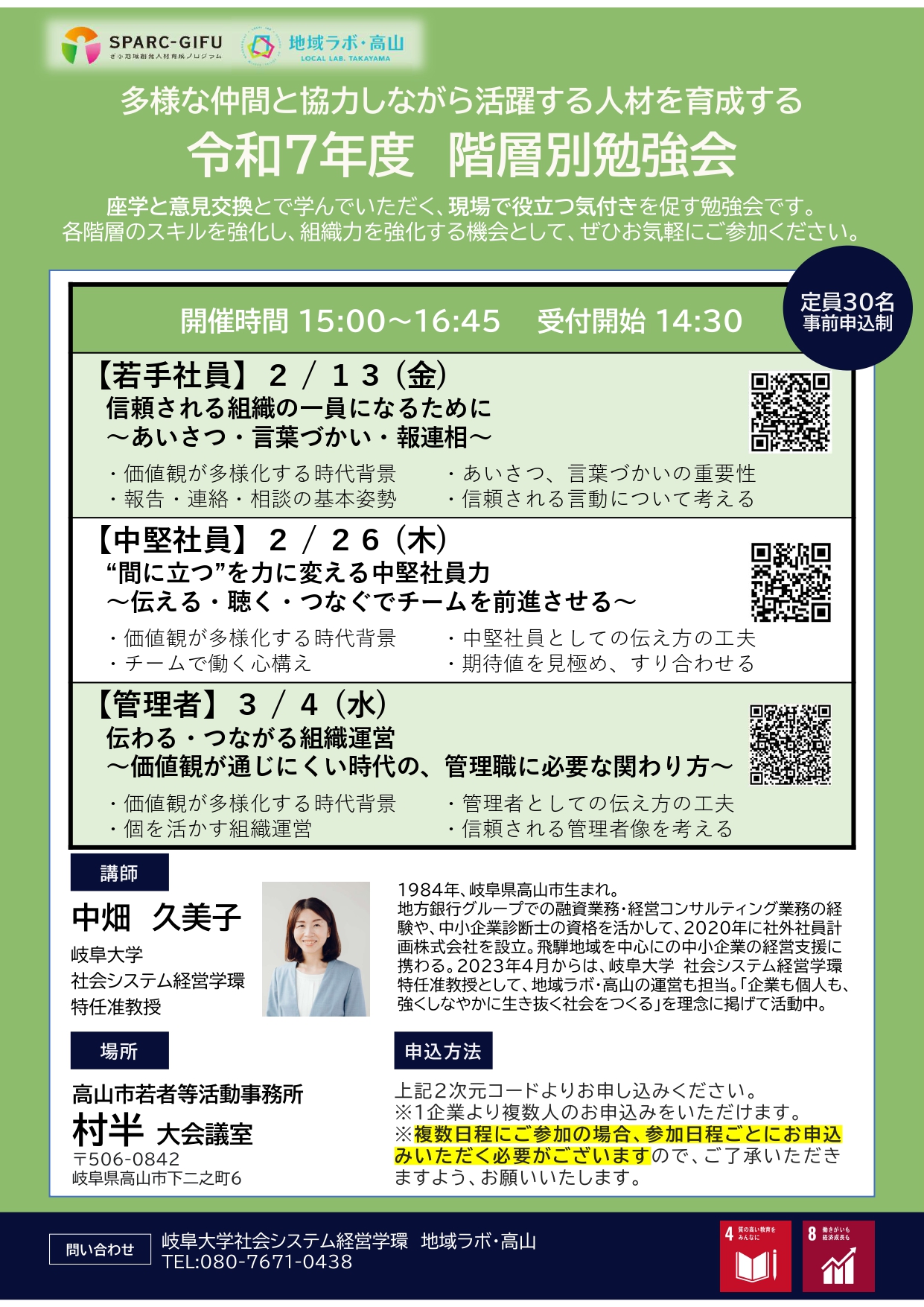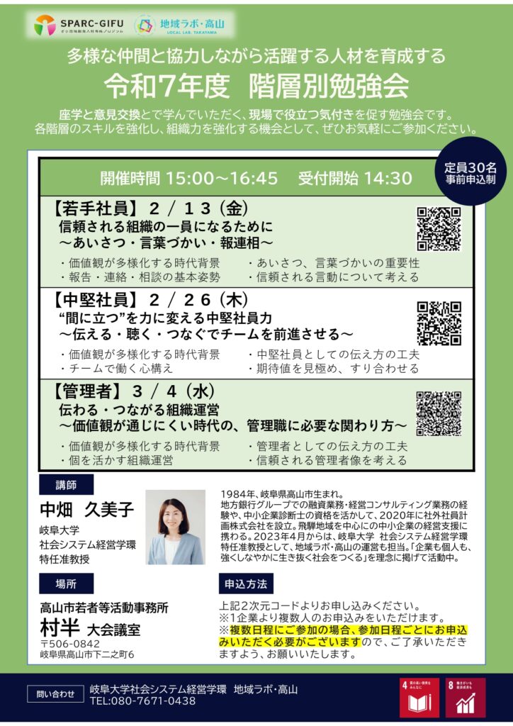 岐阜大学社会システム経営学環/地域ラボ・高山では、社会人向けに階層別のスキルを強化し、組織力を強化するための勉強会を開催します。