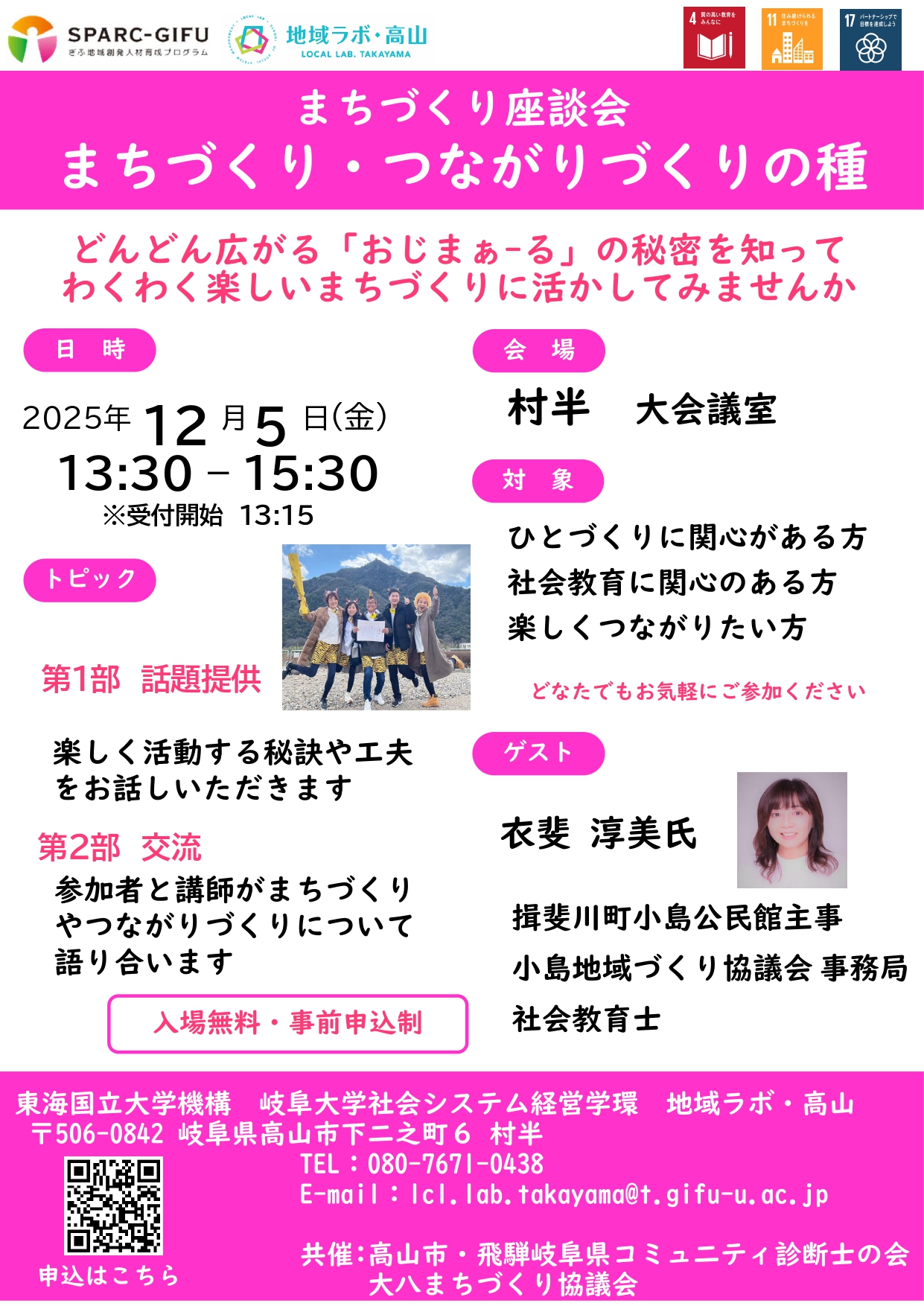 地域ラボ・高山では、令和7年12月5日(金)「まちづくり座談会~まちづくり・つながりづくりの種~」を開催します。どんどん広がる「おじまぁーる」の秘密を知って、わくわく楽しいまちづくりに活かしてみませんか。どなたでもお気軽にご参加ください。