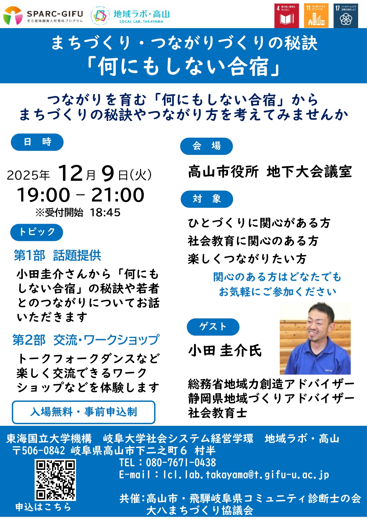 地域ラボ・高山では、令和7年12月9日(金)高山市役所にて「まちづくり・つながりづくりの秘訣~何にもしない合宿~」を開催します。つながりを育む「何にもしない合宿」から、まちづくりの秘訣やつながり方を考えてみませんか。関心のある方はどなたでも、お気軽にご参加ください。