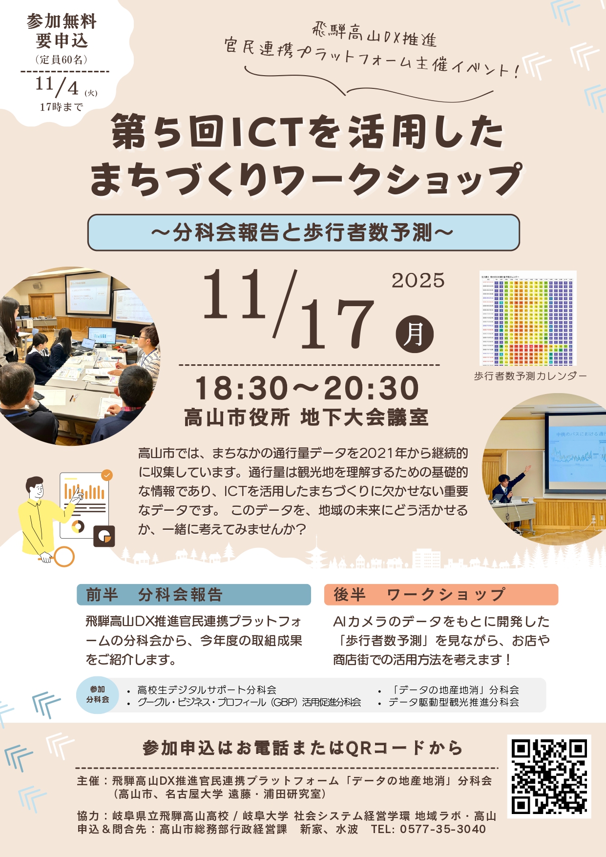 地域ラボ・高山は、令和7年11月17日(月)高山市役所で開催される、飛騨高山DX推進官民連携プラットフォーム主催の「第5回ICTを活用したまちづくりワークショップ~分科会報告と歩行者数予測~」に協力します。