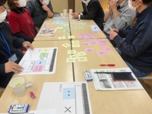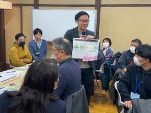 前半は、衣斐氏より楽しく人を巻きこむ取り組み「おじまぁーる」の成功の秘密について、実践事例を交えた話題提供をしていただきました。後半は、ワークショップ形式で、グループごとに「楽しい事業」を考え、発表しました。講師の衣斐さんから講評をいただきながら、ゆるやかで温かい雰囲気の中、まちづくりやつながりづくりについて深く考える時間となりました。