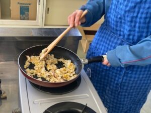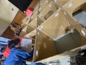 フードロスの削減をテーマにしたグループは、消費期限間近の災害備蓄食を使ったおいしいレシピを考え調理をしました。また、段ボール迷路を組み立て、近くの保育園児と楽しく交流するグループもありました。