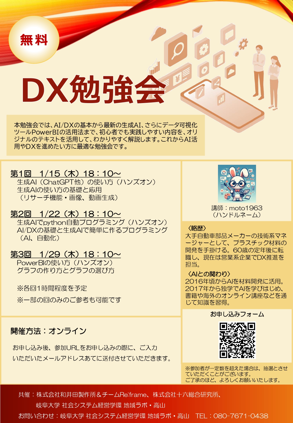 地域ラボ・高山では、株式会社和井田製作所&チームRe:frame、株式会社十六総合研究所と共催で、「DX勉強会」を開催します。開催日は1月15日(木)、22日(木)、29日(木)の3回で、いずれも18:10~オンラインで実施します。
