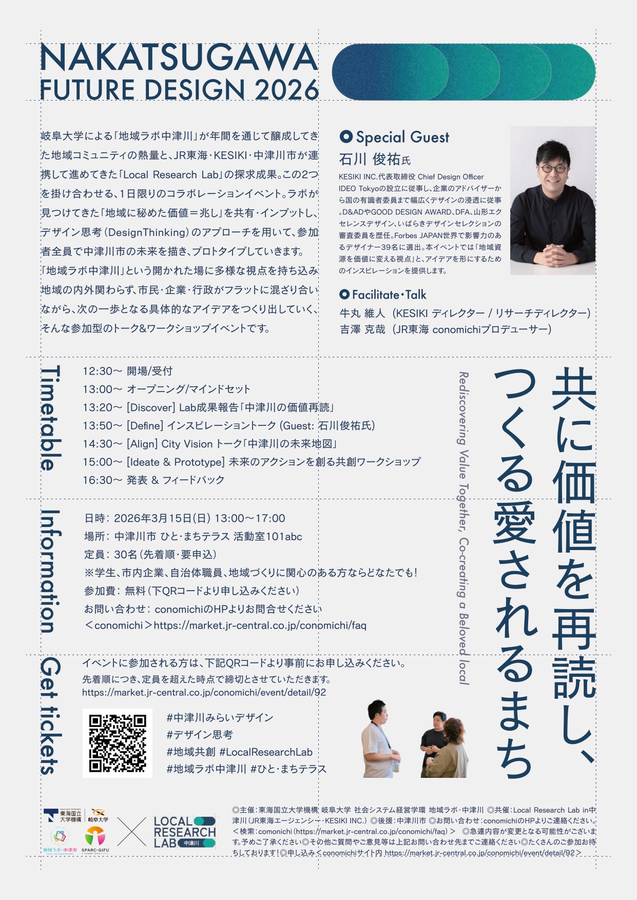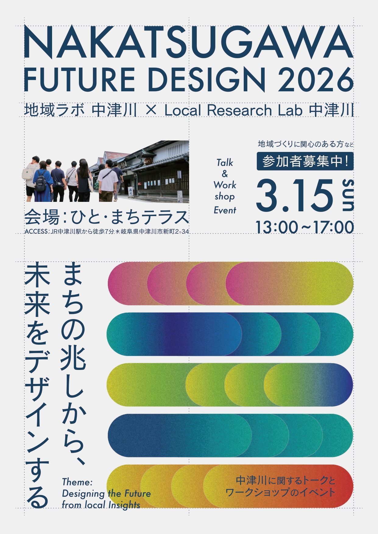 地域ラボ・中津川は、令和8年3月15日(日)「NAKATSUGAWA FUTURE DESIGN 2026~地域ラボ・中津川×Local Research Lab 中津川~」を開催します。